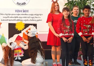 Prosinac je vrijeme radosti, veselja i zajedništva, a u našoj se školi blagdanska čarolija osjeća već tjednima. 23. 12. 2025. godine upriličena je božićna svečanost na kojoj su mali recitatori, glumci i pjevači svojim nastupima ugrijali srca učenika, roditelja, učitelja i svih ostalih zaposlenika. Mali su zboraši svojom pjesmom oživjeli zimu u kojoj stanuju snjegovići i caruje dječja mašta, a veliki zbor uveo nas je u prave božićne radosti vezane uz hrvatske običaje. Baš kao i svake godine, lutkarska skupina izvela je dva igrokaza na posve originalan način. Ovog smo Božića upoznali njihove posvađane klizaljke i zeku te saznali kako se uz malo blagdanskog duha svaki problem može riješiti.